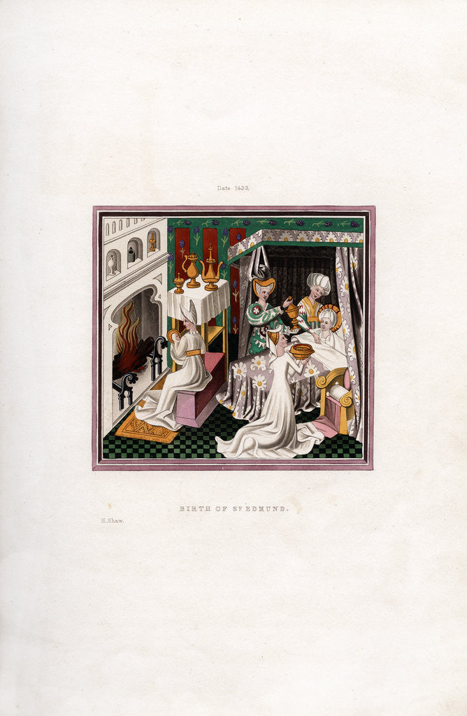 Birth of St Edmund, 1433, (1843). Copy from a manuscript of John Lydgate's Life of St Edmund the King and Martyr, about the life of Edmund, king of the East Angles, who was born at Nuremberg in 841 AD. Illustration from Dresses and Decorations of the Middle Ages from the Seventh to the Seventeenth Centuries, by Henry Shaw, (London, 1843).
