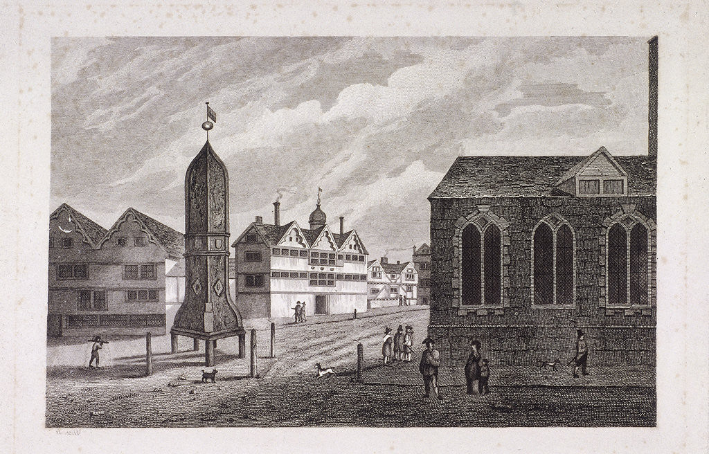 North east view of Bishopsgate, London, looking towards Cornhill, 1814; showing the north side of St Martin Outwich and the pump.