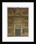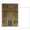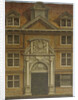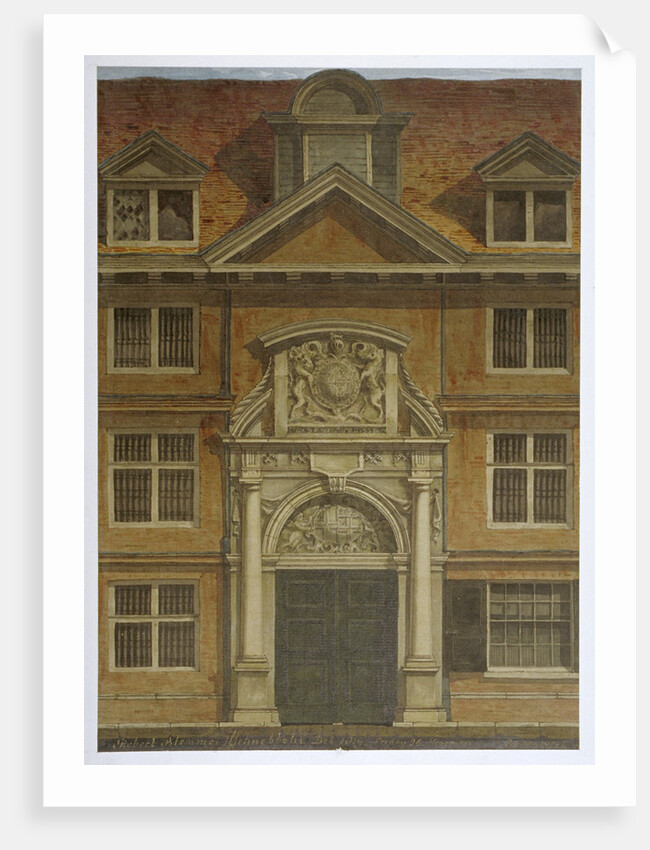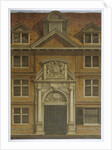 Blackwell Hall, City of London, 1819. Main entrance of Blackwell Hall in King Street, with coats of arms above the door.