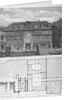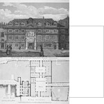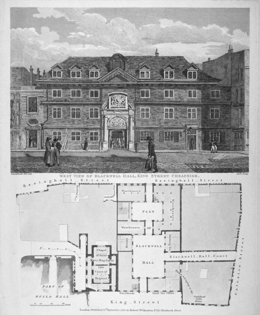 Blackwell Hall, King Street, City of London, 1820. West view of Blackwell Hall, with figures and a plan including part of the Guildhall, Basinghall Street, Cateaton Street, King Street and Blackwell Hall Court.