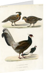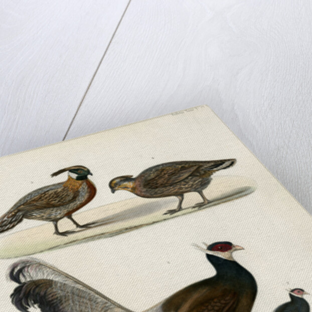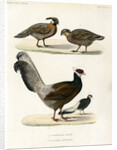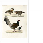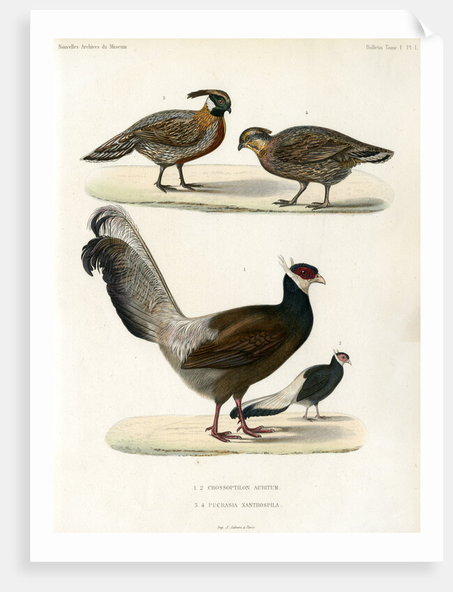 Ornithological studies of male and female birds: figures 1-2 the Blue eared pheasant Crossoptillon auritum, a bird native to China; and figures 3-4 the Koklass pheasant Pucrasia macrolopha (here styled Pucrasia xanthospila, and therefore possibly the Yellow necked koklass). Plate 1 accompanying the paper ‘Rapport sur diverses collections envoyées au museum par le P. Armand David…’ by Alphonse Milne-Edwards, Nouvelles archives du Muséum d’Histoire Naturelle…’ v.1 (Paris, 1865); Bulletin pp.1-30..