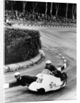BMW Motorbike and sidecar combination, 1957. Germany's Fritz Hillebrand and Manfred Grunwald, the 1957 125cc World Sidecar Champions in action. Grunwald leans out to keep the machine balanced as it negotiates an S-bend. They won the Isle of Man Sidecar TT in both 1956 and 1957. Hillebrand was killed when the pair were involved in an accident in a race at Bilbao, Spain at the end of the 1957. As a result Grunwald then retired.
