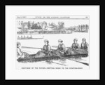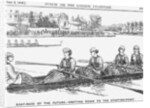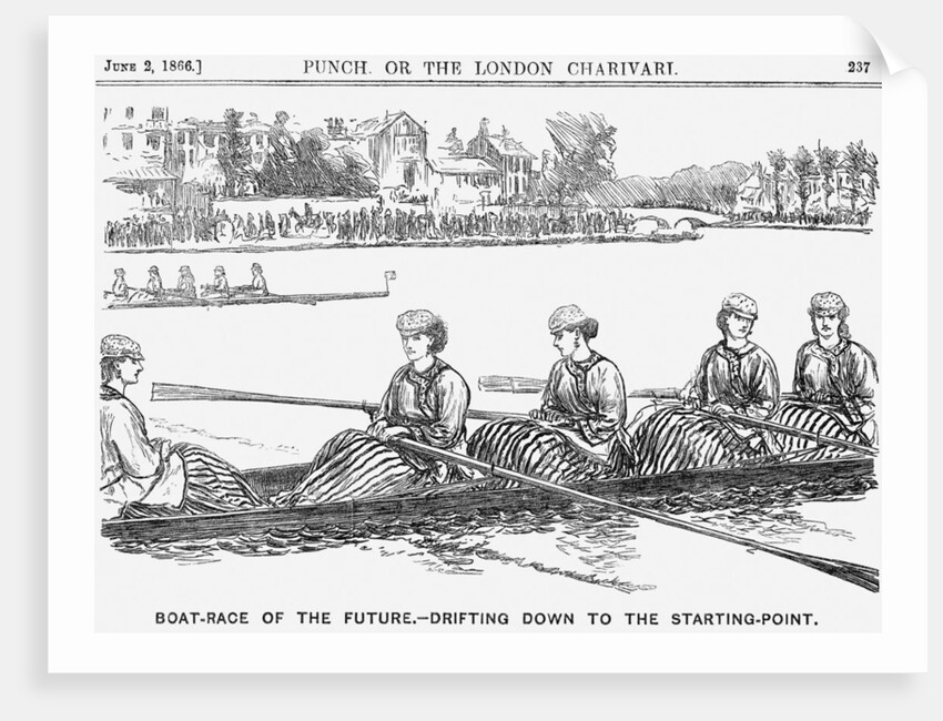 'Boat-Race of the Future - Drifiting Down to the Starting Point', 1866. Boat race crews entirely made up of determined looking ladies. Punch's little dig at the growing participation of young women in sports with a look at the future. From Punch, or the London Charivari, June 2, 1866.