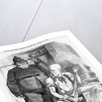 'Bob and The Bobby, Or Only His Fun', 1869. Robert Lowe, the Chancellor of the Exchequer, had proposed devaluing the sovereign by one per cent. Punch disapproved of this proposal and, in this cartoon, Policeman Bull warns Mr Lowe of the risks of pursuing this course of action. From Punch, or the London Charivari, October 16, 1869.