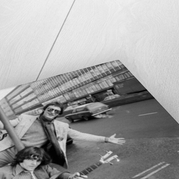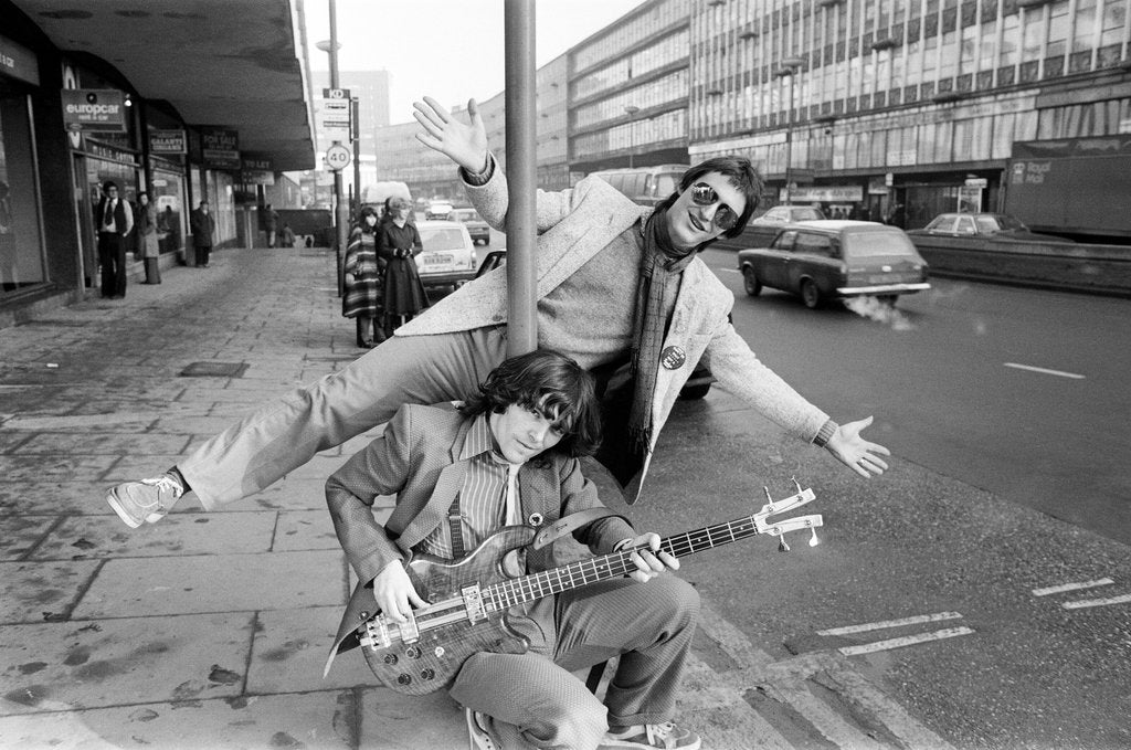 Guitarist Gerry Cott (standing) and bass player Peter Briquette from the Boomtown Rats visited Birmingham to make a trade presentation at a city music shop. 12th January 1979.