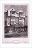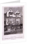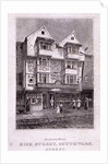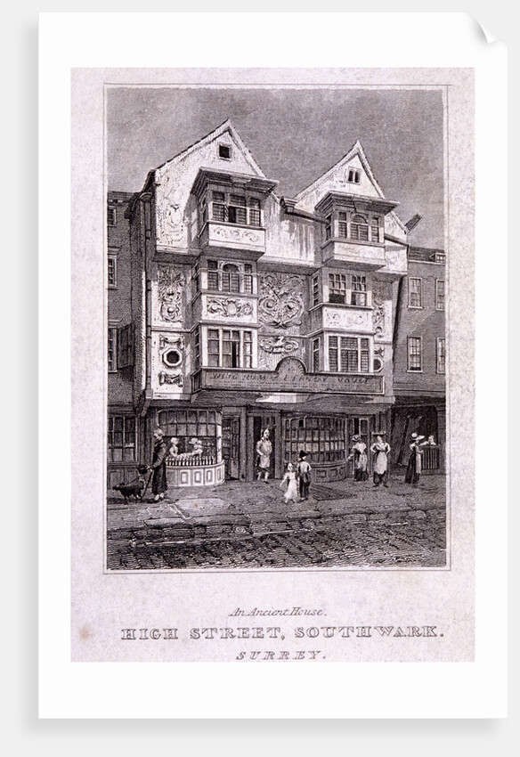 Borough High Street, Southwark, London, c1820. An four-storey 'ancient house' with bay windows and ornate carving or plasterwork on the outside. It advertises wine, rum and brandy so is presumably a public house; people sit inside watching pedestrians pass in the street.
