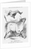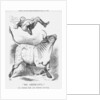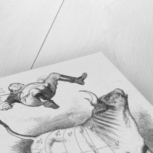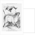 Bos Americanus; , 1877. An American bull, mapped out with its joints and cuts of meat, is carefully priced as it tosses the British butcher out of the way. The butcher has labels showing the price of beef to be 13 pence a pound, and mutton 1shilling a pound. Imports of American meat were growing rapidly and it was hoped that the increasing competition would force the nation's butchers to reduce their inflated prices. From Punch, or the London Charivari, March 10, 1877.