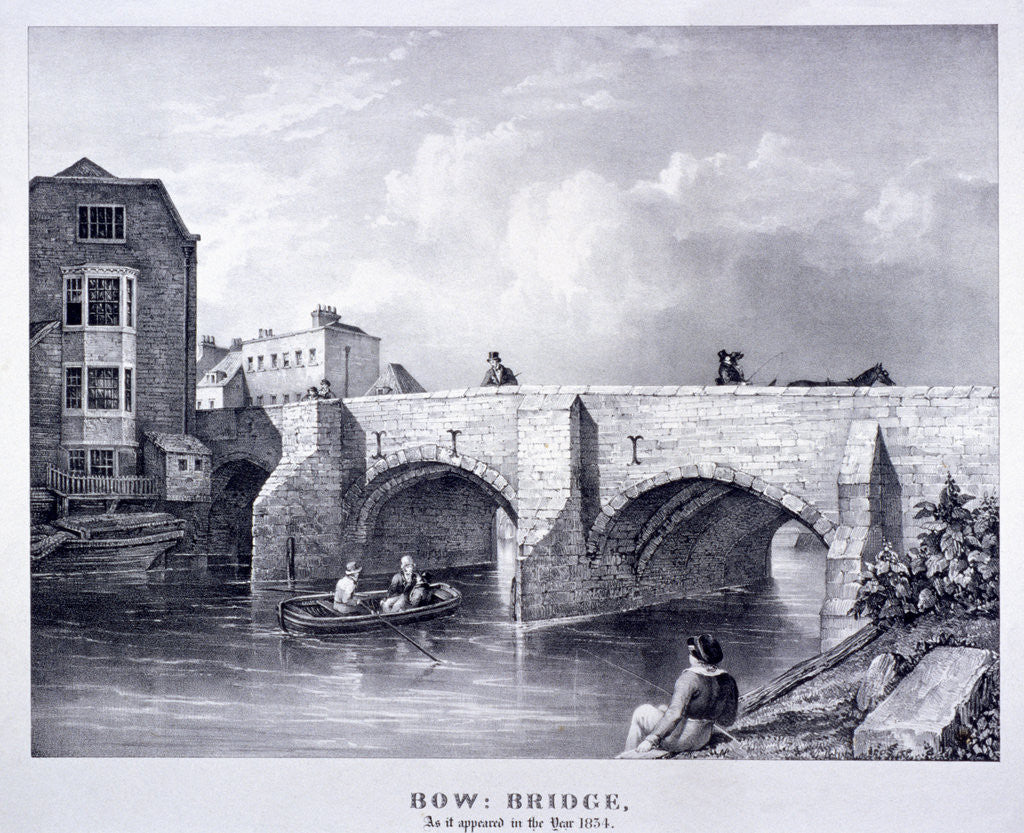Bow Bridge, Poplar, London, 1834. The bridge over the River Lea at Bow; two men pass under an arch in a rowing-boat, a boy fishes from the bank, pedestrians and a carriage cross the bridge.