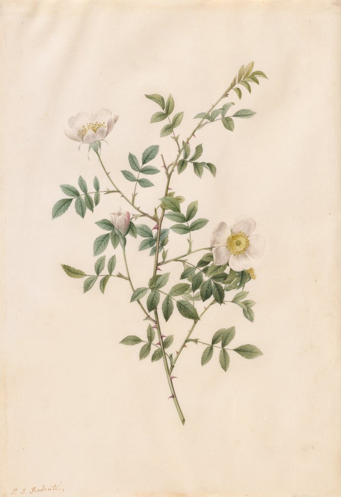 Brier Bush Rose or Dog Rose (Rosa Sepium Rosea), 1817-1824. Les Roses was commissioned by the empress Josephine who, after marrying Napoleon Bonaparte in 1795, rebuilt the royal country estate Malmaison and its opulent gardens. An immense hothouse was constructed to shelter her magnificent collection of rare and exotic plants, which included 250 varieties of roses.