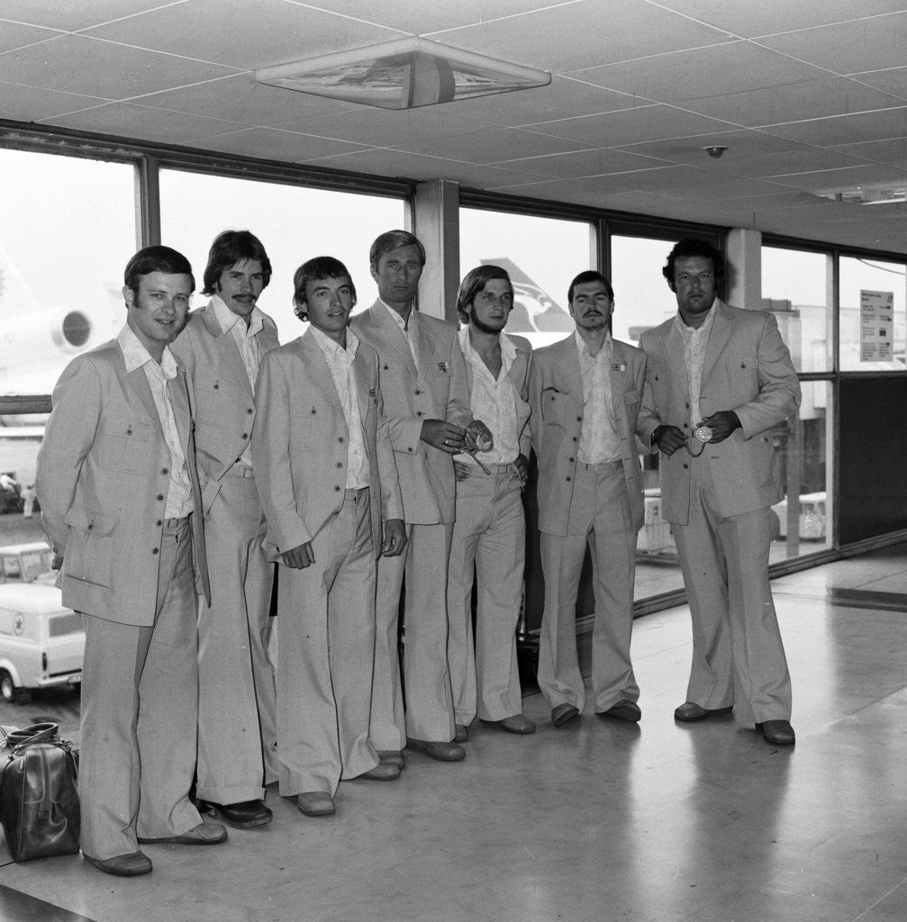1976 British Olympic Team Returns Home, London Heathrow Airport, 3rd August 1976. Amongst the medal winners was David Wilkie, 2nd Left, Olympic Champion, 200 metre breaststroke.