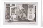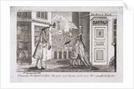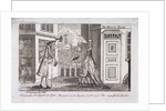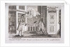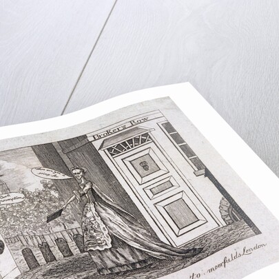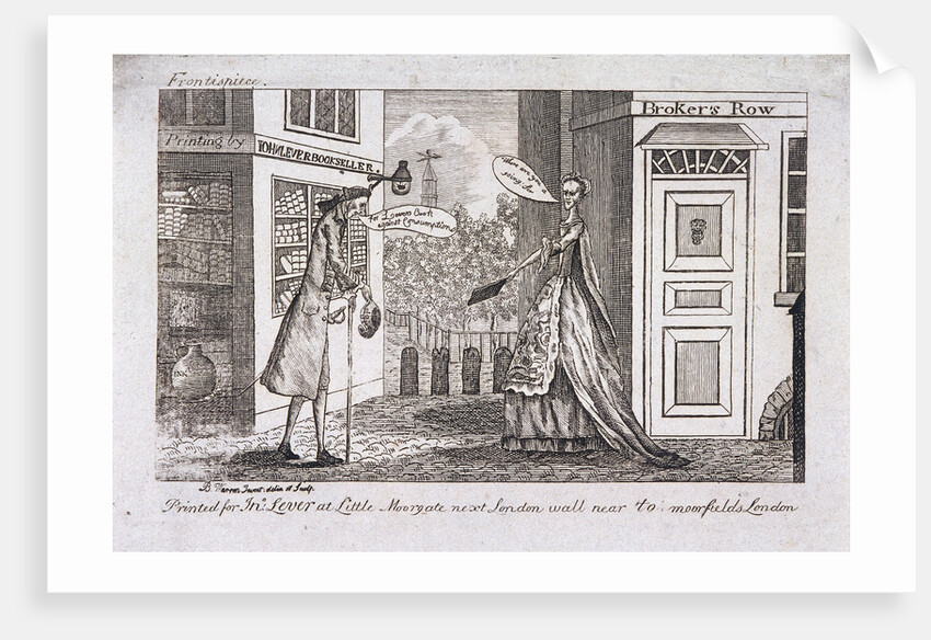 Scene of a man and woman discussing a book on consumption, printed by John Lever, outside John Lever's bookshop on Broker Row, (now Blomfield Street), London, c1780.