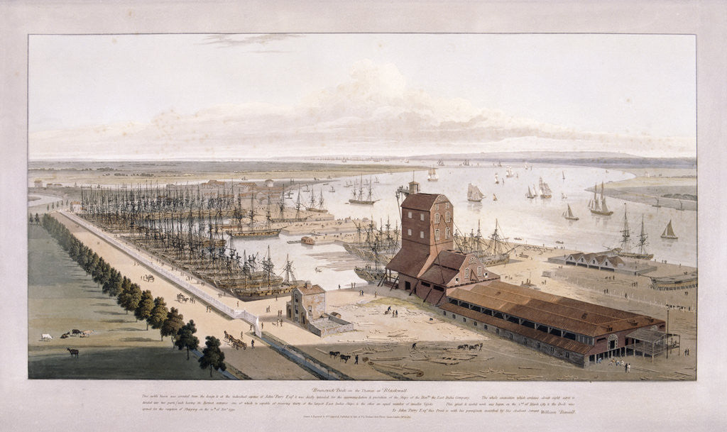 Brunswick Dock, and East India Dock, Poplar, London, 1803. Brunswick and East India Docks looking east with the River Lea in the middle distance and Perry's Masthouse on the right. Rows of ships are moored in the dock, with more traffic on the River Thames.