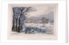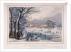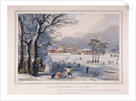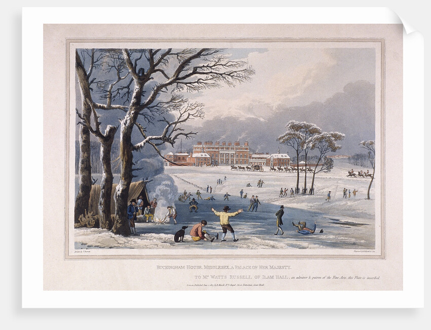 Buckingham House and St James's Park in the winter, London, 1817. Snowy scene with people skating on a frozen lake. A tent has been erected and a group of figures gather around a fire on the ice. Buckingham House, in the background, was reconstructed as Buckingham Palace in the 1820s.