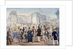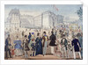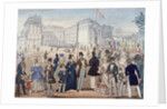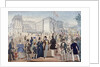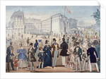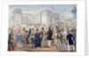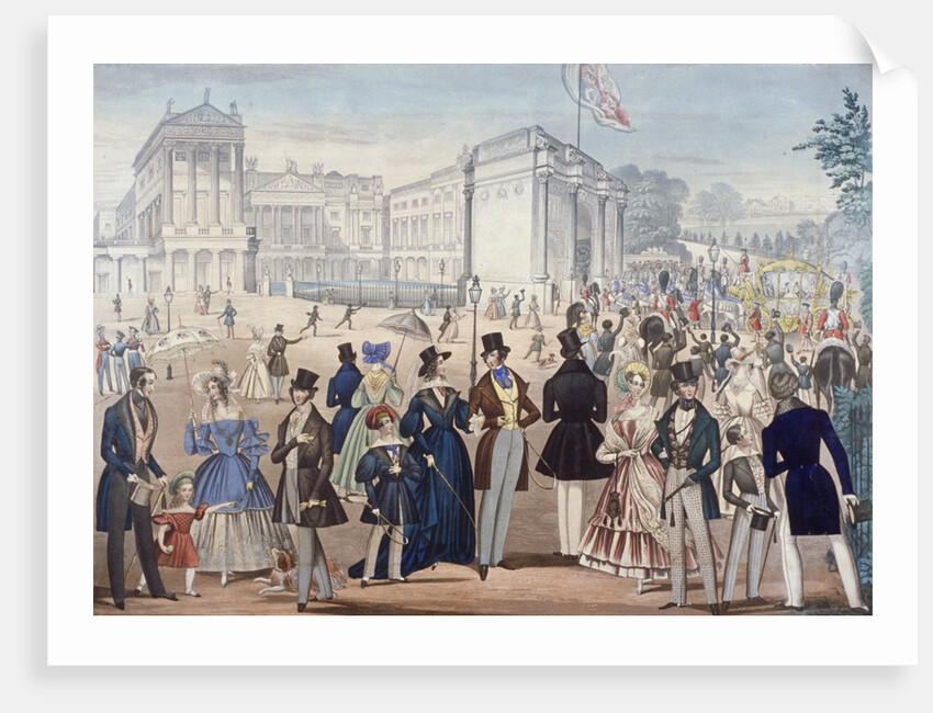 Buckingham Palace, London, 1839. View showing Queen Victoria returning from the House of Lords in the right hand middle distance, the front of Buckingham Palace, and the Marble Arch in its original position. In the foreground a range of fashionably dressed men, women and children can be seen.