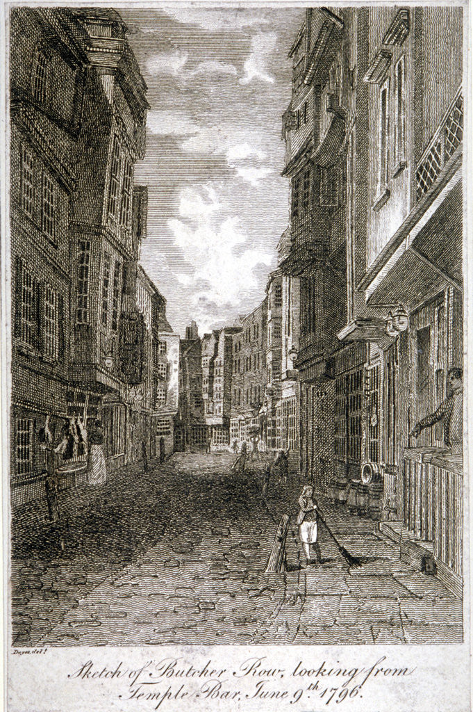 Butcher Row, Westminster, London, 1796. View along Butcher Row from Temple Bar.