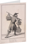 'Buy my fat Chickens'. A chicken seller, from Cries of London, (1688?). A man carrying baskets of chickens.