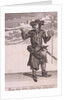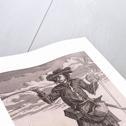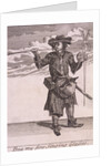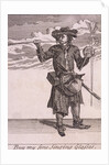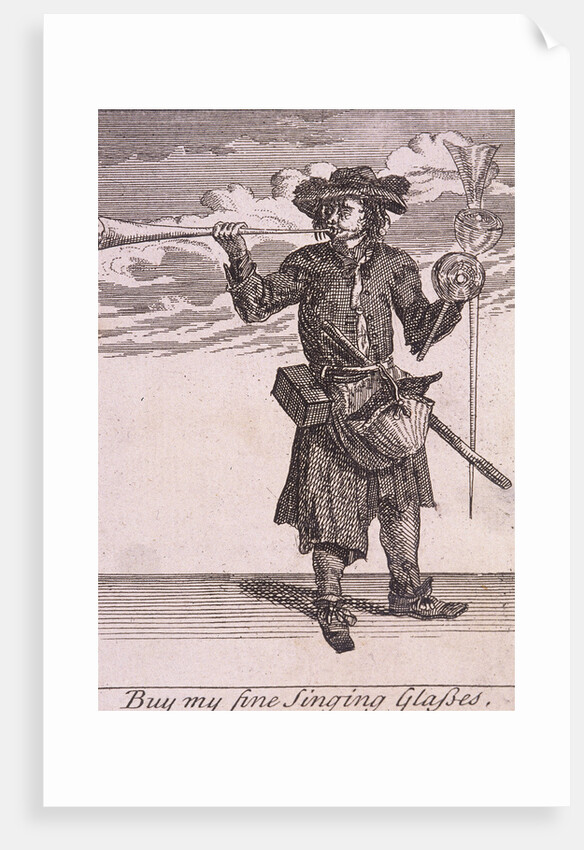 'Buy my fine Singing Glasses'. A street seller carrying a number of elongated glass funnels, one of which he is blowing like a trumpet. From Cries of London, (c1688?).