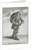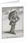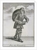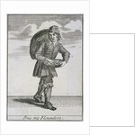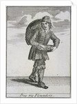 'Buy my Flounders'. A flounders seller, carrying a tray, and a large basket on his back. From Cries of London, (c1688?).