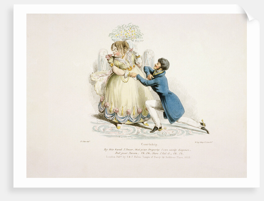 'By this hand I swear that your property can easily dispense - but your person - oh, oh - there I feel it - oh, oh.', 1828. A young suitor kneels in front of a plump and unattractive young lady.