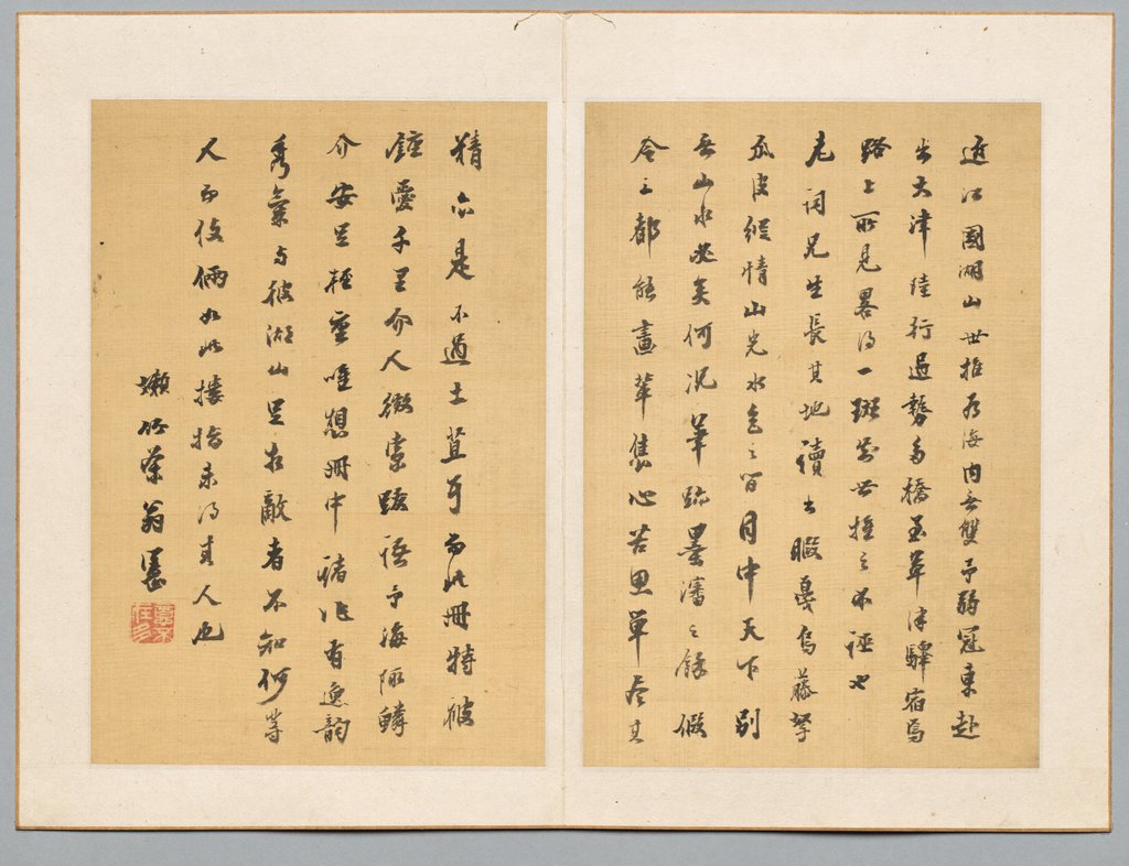 Calligraphy, early 19th century. The Nanga, or "Southern School" painters of 17th- and 18th-century Japan were greatly influenced by Chinese culture. The subjects and styles of their work reflected the contemporary Japanese taste for imported Chinese objects and learning. A common practice among Nanga painters was the exchange of small paintings and calligraphies. They also celebrated special gatherings of artist-friends by producing individual sheets that were then gathered together in albums. The sheets shown here were part of such a gathering.