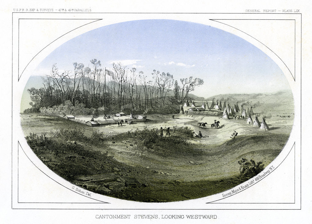 Camp Stevens, looking westward, Montana, USA, 1856. Camp Stevens served as a base for metereological observation and side explorations in the Rocky Mountains for the United States Pacific Railroad Survey. Print from Reports of Explorations and Surveys to Ascertain the Most Practicable and Economical Route for a Railroad from the Mississippi River to the Pacific Ocean made under the direction of the Secretary of War in 1853-1855, by Beverley Tucker, volume III, published by Sarony, Major and Knapp (Washington, 1856).