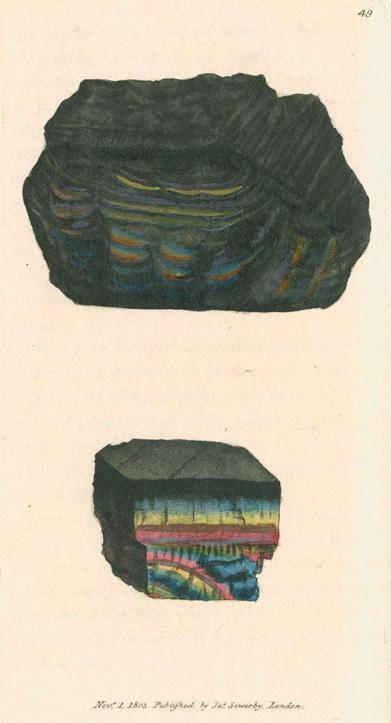 Two specimens of Denbigh coal from Denbighshire in Wales, here termed 'oxygenized carbon'. Plate 49 from British mineralogy: or coloured figures intended to elucidate the mineralogy of Great Britain, by James Sowerby, volume 1 (London, R.Taylor & Co., 1804). The accompanying text states that 'There is little doubt of the Denbigh caol being nearly as pure an oxide of carbon as is likely to be found...fracture and the prismatic hues for which this coal is famous, have naturally gained it the appellation of Peacock coal...' The plate is inscribed: 'Novr. 1 1803. Published by Jas. Sowerby, London.