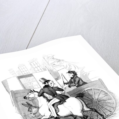 Cartoon on a riding theme, 19th century. Holloa, my good man, are you aware, that the veel of your vehicle is soiling my pantaloons? Oh granny, then vy don't you get out of the vay of the veel.