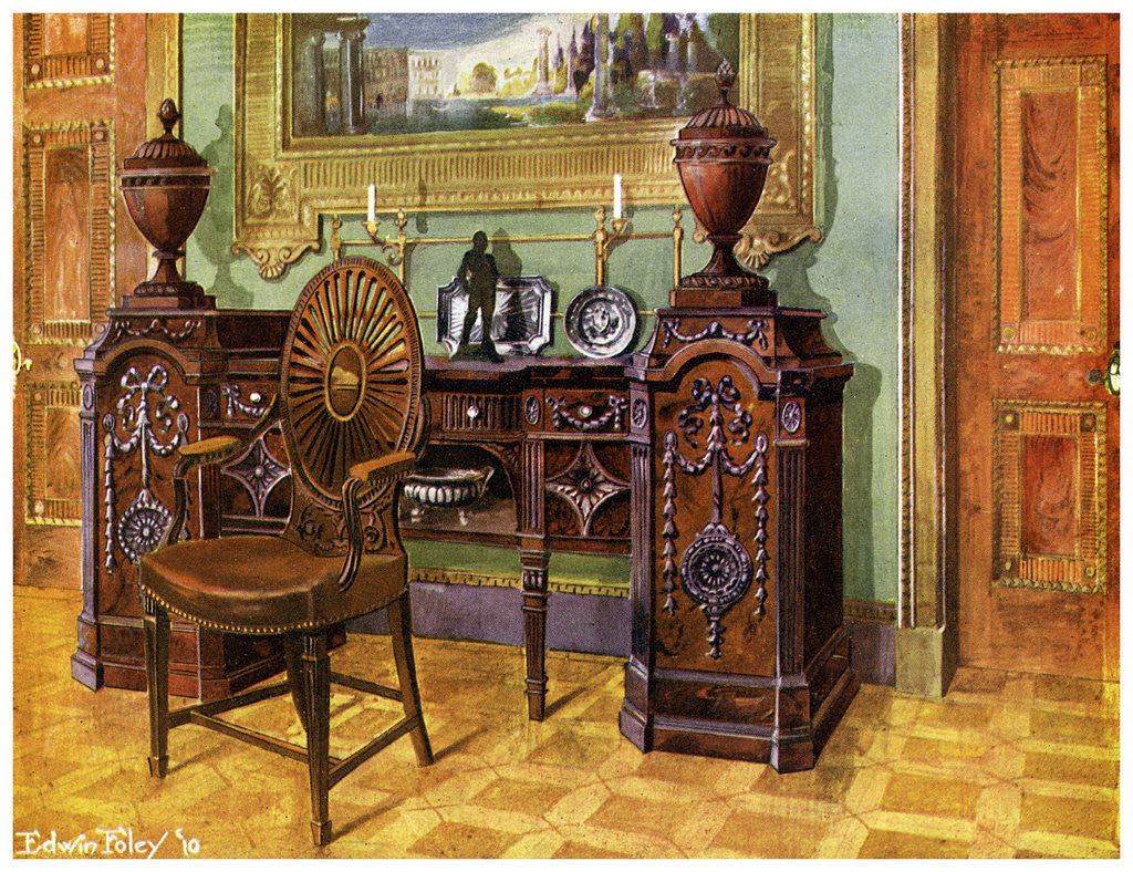 Carved mahogany pedestal sideboard and oval wheelback master's chair, 1911-1912. A print from The Book of Decorative Furniture its Form, Colour and History, Volume II by Edwin Foley, TC and EC Jack Ltd, London, 1911-1912.