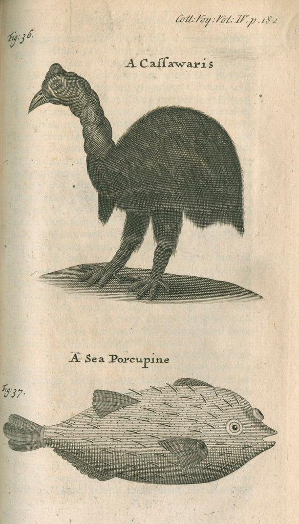 Two zoological of creatures observed by William Funnell. Figure 1 [Inscribed 'Fig:36'] captioned: 'A Cassawaris'. Figure 2 [Inscribed 'Fig:37'] captioned: 'A Sea Porcupine'. Plate facing p.182 in: A voyage round the world. Being an account of Capt.William Dampier's expedition to the South Seas in the ship St.George. With his various adventures and engagements by W Funnell; within volume 4 of A collection of voyages..., by William Dampier et.al., 4 volumes, (London, James and John Knapton, 1729). Copy belonging to Sir Joseph Banks (1743-1820), President of the Royal Society. William Funnell (active early 18th century) sailor and explorer, acted as Mate aboard the vessel St George, captained by William Dampier (1651-1715).