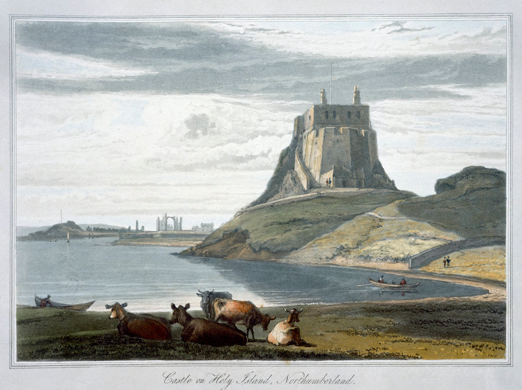 'Castle on Holy Island, Northumberland', 1822. View of Lindisfarne Castle on the Northumbrian coast. The island, also known as Holy Island, was the site of a monastery founded by St Aidan in c635. The castle dates from the 16th century. From A Voyage Around Great Britain Undertaken between the Years 1814 and 1825 by William Daniell.
