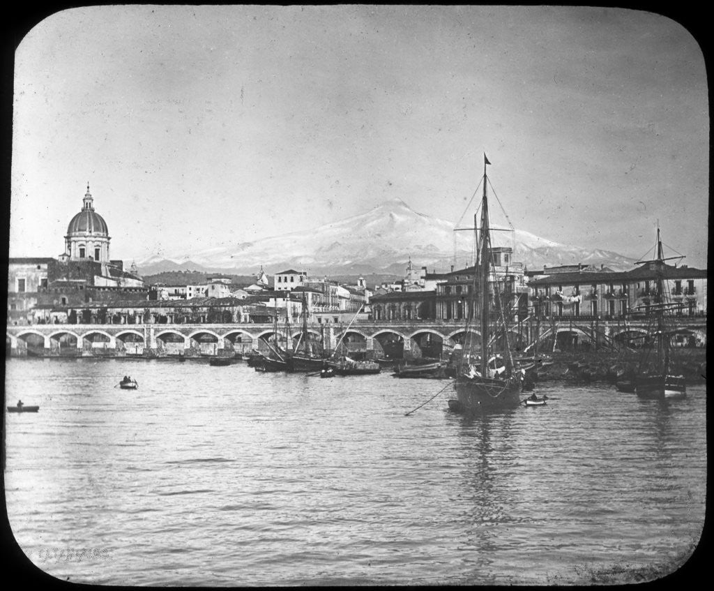 Catania and Mount Etna, Sicily, Italy, late 19th or early 20th century. Lantern slide.