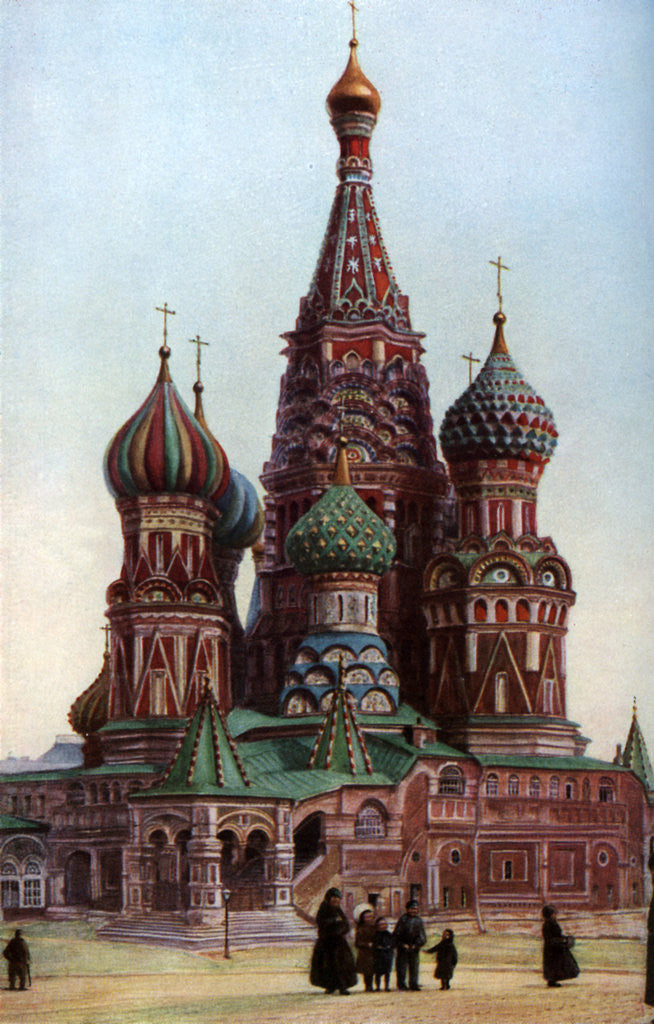 Cathedral of St Basil, Moscow, Russia, c1930s. Also known as the Intercession Cathedral, St Basil's Cathedral was commissioned by Ivan the Terrible to commemorate the capture of Kazan and was built between 1555 and 1561. It is best known for its spectacular colourful onion domes. A print from Countries of the World, edited by JA Hammerton, volume IV, The Fleetway House, c1930s.