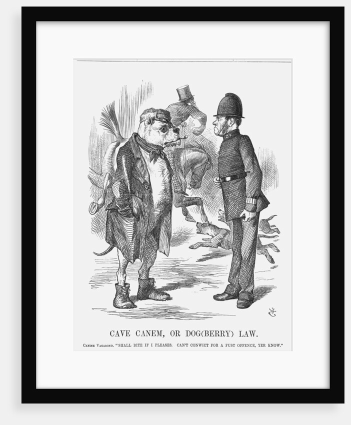 'Cave Canem, or Dog(berry) Law', 1867. The canine vagabond says Shall Bite if I pleases. Can't Conwict for a Fust Offence, yer know. Therefore the British bobby has his hands tied. In the background, various other dogs snap at the hooves of a bucking horse. From Punch, or the London Charivari, September 14, 1867.