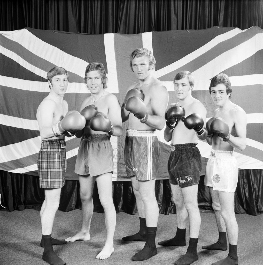 "Champions" - and they're all British: Greath Britain holds a world record of six European boxing champions. They are Joe Bugner, Heavyweight, Johnny Clark, bantamweight, John Conteh, light heavyweight, John Stracey, welterweight, Kevin Finnegan, middleweight, and Ken Buchanan, lightweight. L-R: Ken Buchanan, Kevin Finnegan, Joe Bugner, John Stracey, Johnny Clark and John Conteh. 9th June 1974