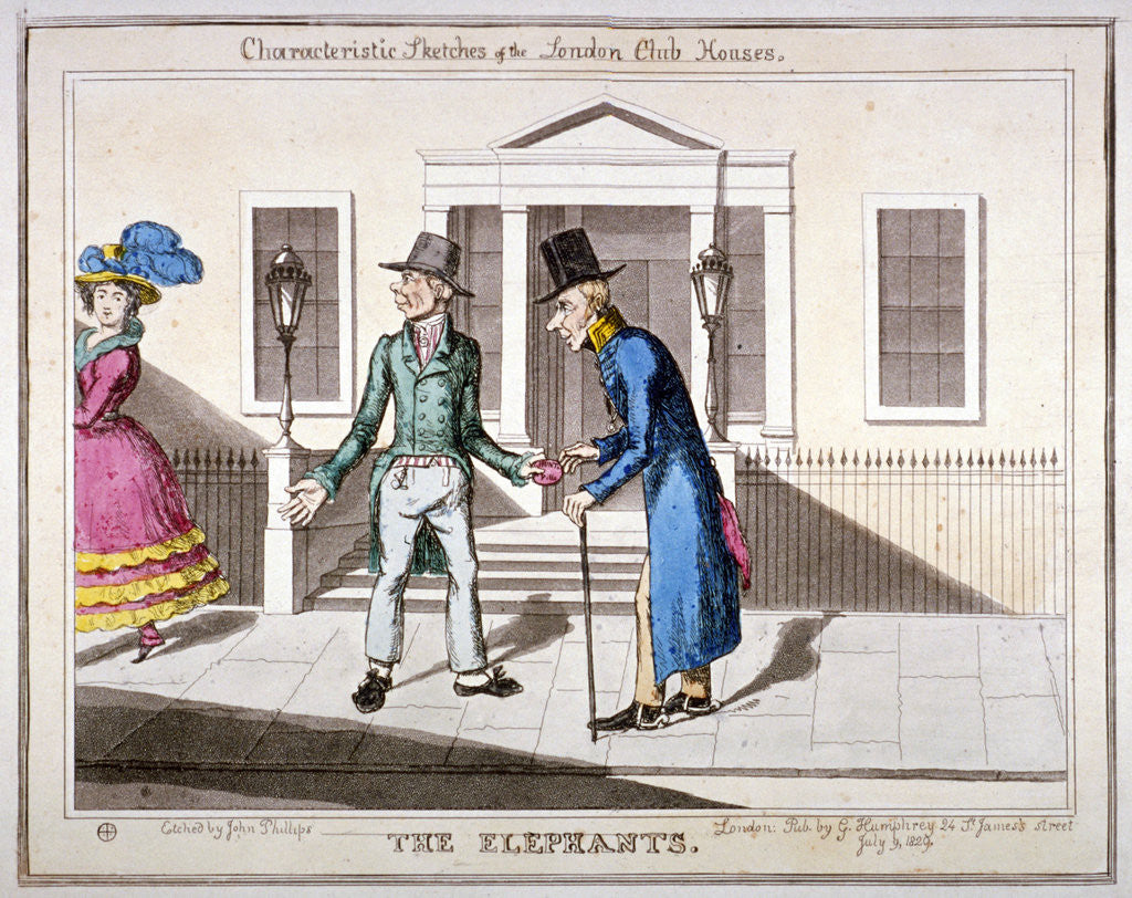 'Characteristic sketches of the London club houses': 'The Elephants', 1829. Scene showing two members of the Athenaeum on Pall Mall, looking at a woman passing by.