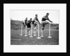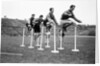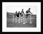 Charlton Athletic team training exercises at the Valley. Players practicing their jumping ability as they leap over obstacles. Second right is striker Eddie Firmani who scored 25 goals as a No.10 during the 1954-55 season. 9th August 1954.