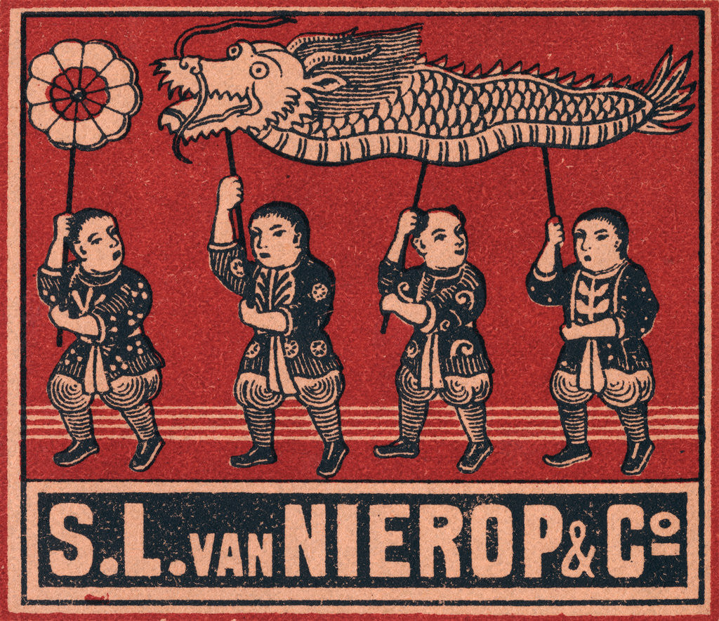 Product details Chinese Matchbox Label with Children Holding a Parade Dragon