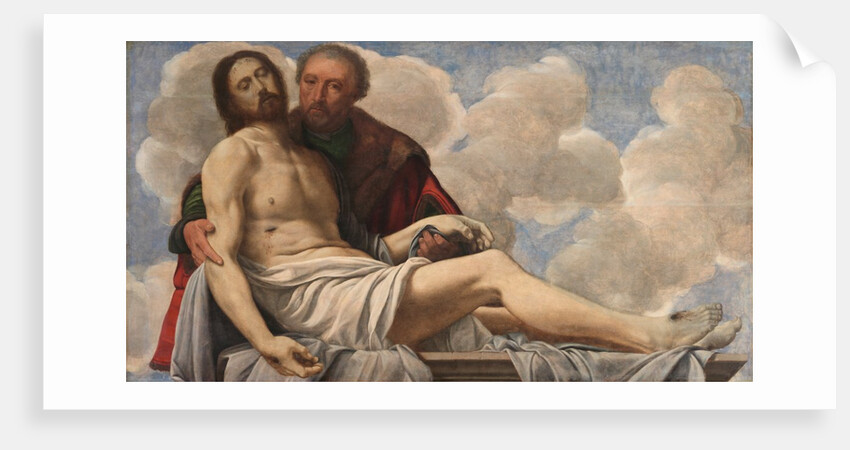 Christ with Joseph of Arimathea, c. 1525. After the Crucifixion, Joseph of Arimathea obtained permission to bury Christ?s body in Joseph?s own tomb. Aside from an amorphous, cloudy sky, Savoldo eliminated the background entirely and reduced the narrative to two monumental figures, brought to the front of the picture plane. These qualities surely had a great impact on Caravaggio, who initially trained in Northern Italy, where Savoldo spent his career. This work originally hung over a large altarpiece, which explains the unusual perspective, the panel?s horizontal shape, and the figures? position above the viewer.