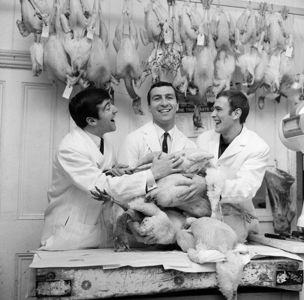 West Ham winger Peter Brabrook who has a butcher's shop in East London was assisted in sorting out his Christmas turkeys by 2 mates of his. Terry Venables of Spurs and Tom Baldwin of Arsenal. All the players share in common one thing, they have all played
