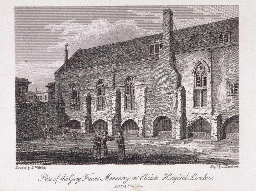 View of Christ's Hospital, formerly part of Greyfriars Monastery, London, 1812. A group of figures stands in the courtyard in front of the hospital.