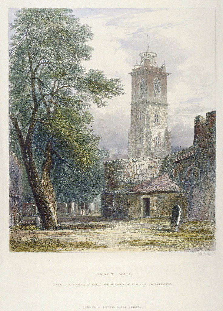 Church of St Giles without Cripplegate, City of London, 1851. View of St Giles without Cripplegate and the base of a tower in the churchyard.