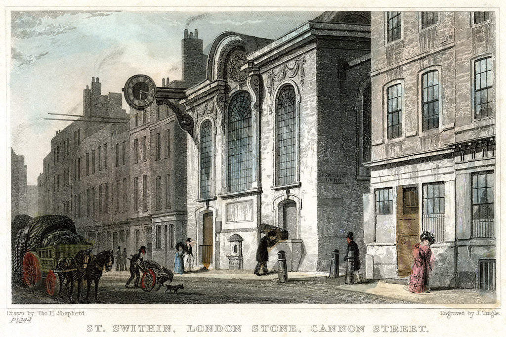 Church of St Swithin and the London Stone, Cannon Street, City of London, c1830. Said to be the spot from which the Romans measured all distances in Britannia, the London Stone is an ancient oolite stone that was set into the wall of St Swithin's Church. The church was destroyed in a German bombing raid during the Second World War but the Stone was left unscathed.