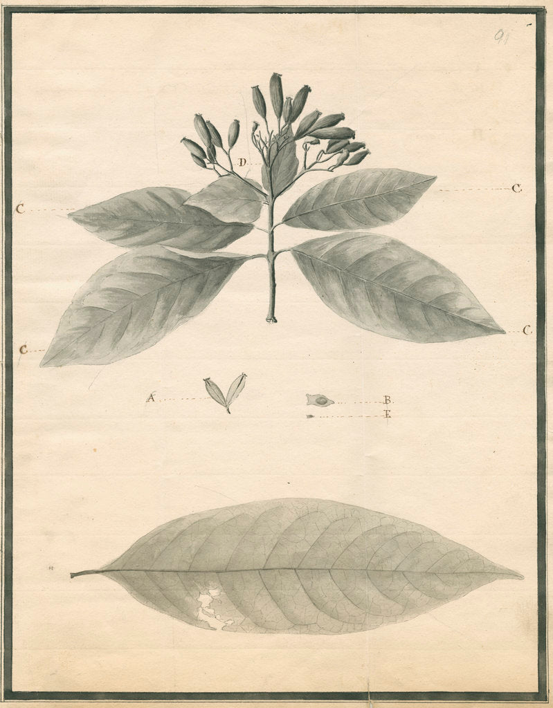 Plate 19 figures B-E from the paper 'An account of a new species of the Bark-tree, found in the Island of St Lucia', by George Davidson, Philosophical Transactions of the Royal Society, vol.74 part 2 (1784), pp.452-456. Botanical studies of parts of a tree from the West Indies used as an anti-malarial treatment. Several details were taken from this original work to form part of the published plate, notably the seed vessels, and details of magnified seeds. However the main works, a sprig from the tree with unopened seed pods and a study of the leaf were not reproduced. A key to the illustration, headed 'Plate IInd' appears in ink verso: 'A. 'Capsula bilocularis...B. Semen alatum magnificutum...C. Folia oblonga. Districha. D. Cyma. E. Seminis magnitude vera.' Not signed.