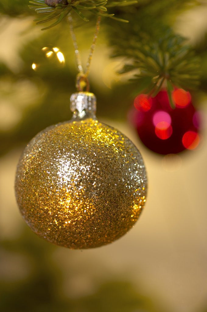 Product images of Close-up of a golden hanging Christmas bauble on blurred tree