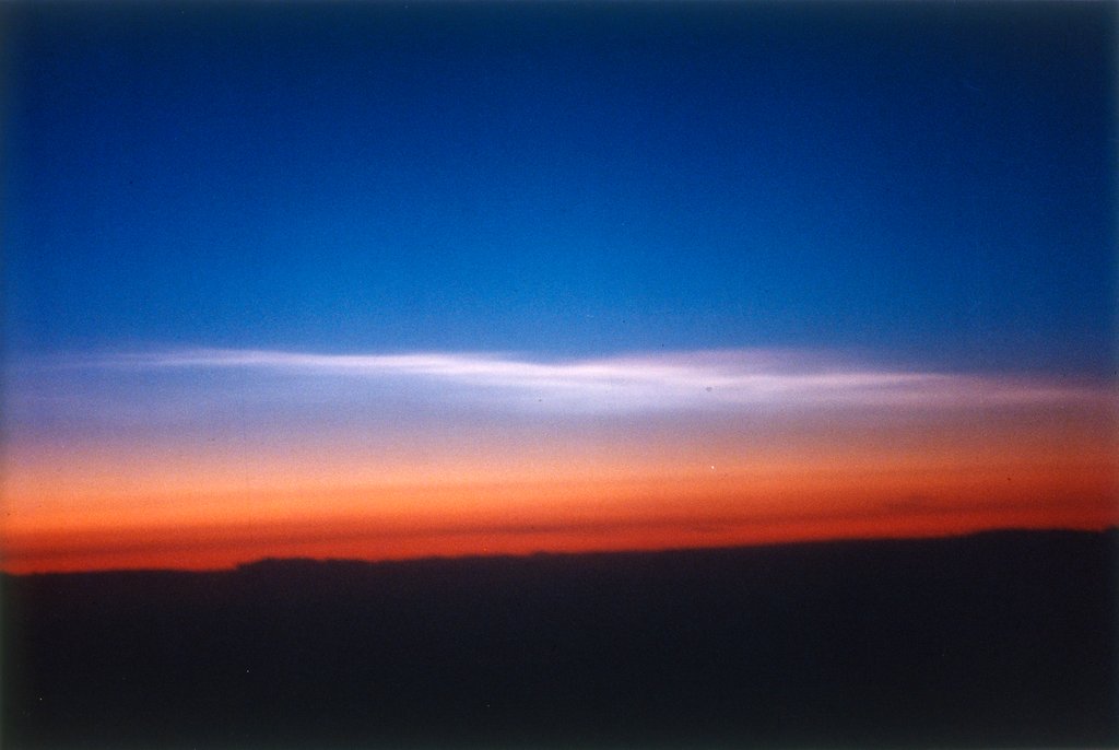 Clouds 39,000 feet north of Stavanger, Norway, seen from DC-8 plane. Type I and Type II polar stratospheric clouds near the North Pole. Type I are the dark orange or brown layer, and Type II is the white layer above. NASA operates a modified Douglas DC-8 jetliner aircraft as a flying science laboratory.