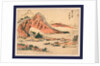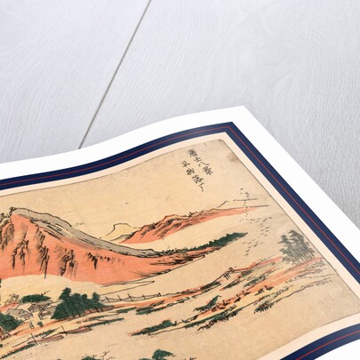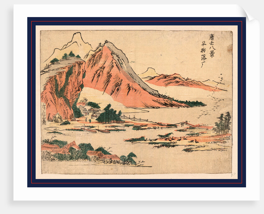 Heisa Rakugan, Geese Descending on a Sandbank. [Between 1804 and 1818], 1 Print : Woodcut, Color ; 17.3 X 22.9 ., Print Shows a Cluster of Buildings in the Shadow of Mountains and Along the Shore of a Body of Water; a Flock of Geese Has Landed on the Sandy Shoreline.