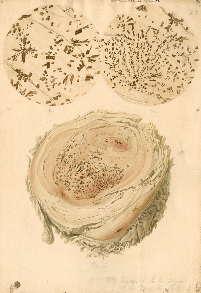 Plate 1 from the Croonian Lecture paper 'A farther investigation of the component parts of the blood', by Everard Home, Philosophical Transactions of the Royal Society, vol.110 (1820), pp.1-10. Section through an 'anuerismal tumor' with two views of crystalized salts under magnification. Figure 1 appearing here on the bottom of the plate was moved in the published version, the subject of a pencilled note to the engraver, lower left: 'NB Figure 1 to be placed at the top of the Plate.'