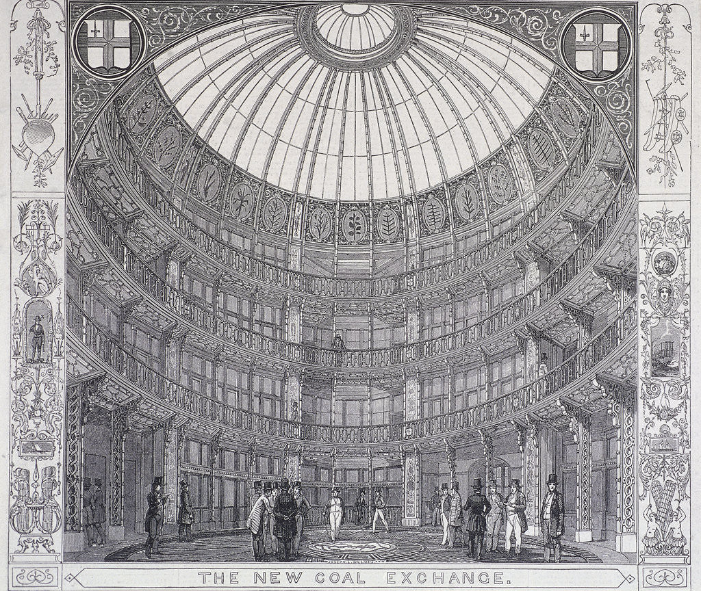 Interior view of the Coal Exchange, London, 1849; with figures. Vertical borders contain decorative features.