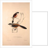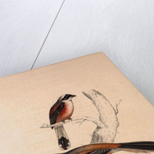 Collurio Hardwickii, Collurio Erythronotus. Birds from the Himalaya Mountains, engraving 1831 by Elizabeth Gould and John Gould. John Gould was working as a taxidermist,he was known as the 'bird-stuffer', by the Zoological Society. Gould's fascination with birds from the east began in the late 1820s when a collection of birds from the Himalayan mountains arrived at the Society's museum and Gould conceived the idea of publishing a volume of imperial folio sized hand-coloured lithographs of the eighty species, with figures of a hundred birds. Elizabeth Gould made the drawings and transferred them to the large lithographic stones. They are called Gould plates.