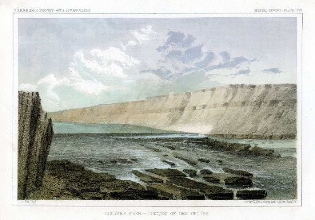 'Columbia River, Junction of the Des Chutes', 1856. The Columbia River at the junction of the Deschutes River near present-day Maryhill, Washington. Print from Reports of Explorations and Surveys to Ascertain the Most Practicable and Economical Route for a Railroad from the Mississippi River to the Pacific Ocean made under the direction of the Secretary of War in 1853-1855, by Beverley Tucker, volume III, published by Sarony, Major and Knapp (Washington, 1856).